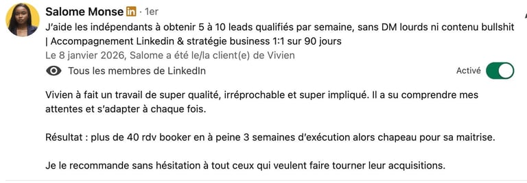 Nous construisons une stratégie LinkedIn complète : branding et positionnement pour asseoir votre crédibilité, ciblage précis de vos décideurs, messages personnalisés à forte valeur, puis relances optimisées pour transformer les contacts en rendez-vous qualifiés.